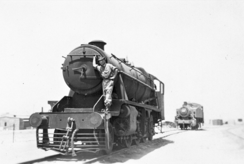 A British War Department Stanier 8F with a U.S. Army Transportation Corps S100 in the background